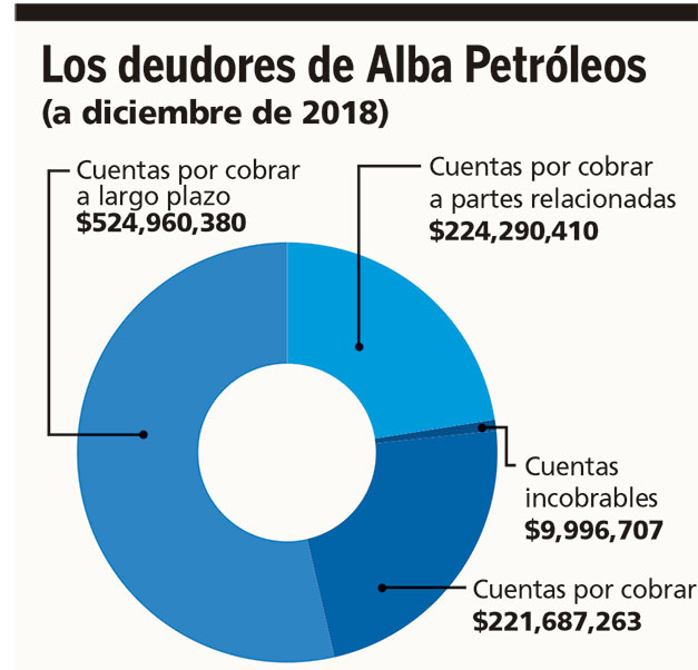 Además de los créditos a largo plazo que ha otorgado Alba Petróleos, la sociedad reportó, hasta diciembre de 2018, $221,687,263 de cuentas por cobrar, $9,996,707 de cuentas incobrables y $224,290,410 de cuentas por cobrar a partes relacionadas.