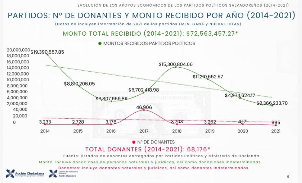 El financiamiento privado a los partidos políticos salvadoreños ha disminuido de $19.3 millones que recibieron los partidos en 2014 hasta $2.3 millones en 2021, una caída de 87.8 %, según datos del informe “Evaluación de los apoyos económicos de los partidos políticos salvadoreños (2014-2021)” de la Asociación Acción Ciudadana.