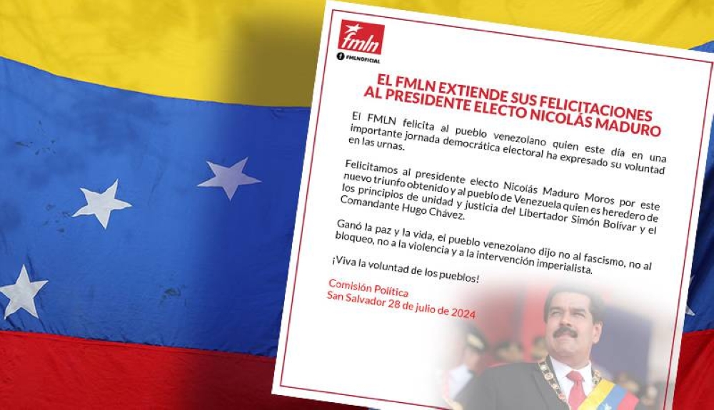 El partido de izquierda salvadoreña, Frente Farabundo Martí para la Liberación Nacional (FMLN) felicitó a Nicolás Maduro por obtener un “nuevo triunfo” en las elecciones presidenciales venezolanas realizadas este domingo 28 de julio.