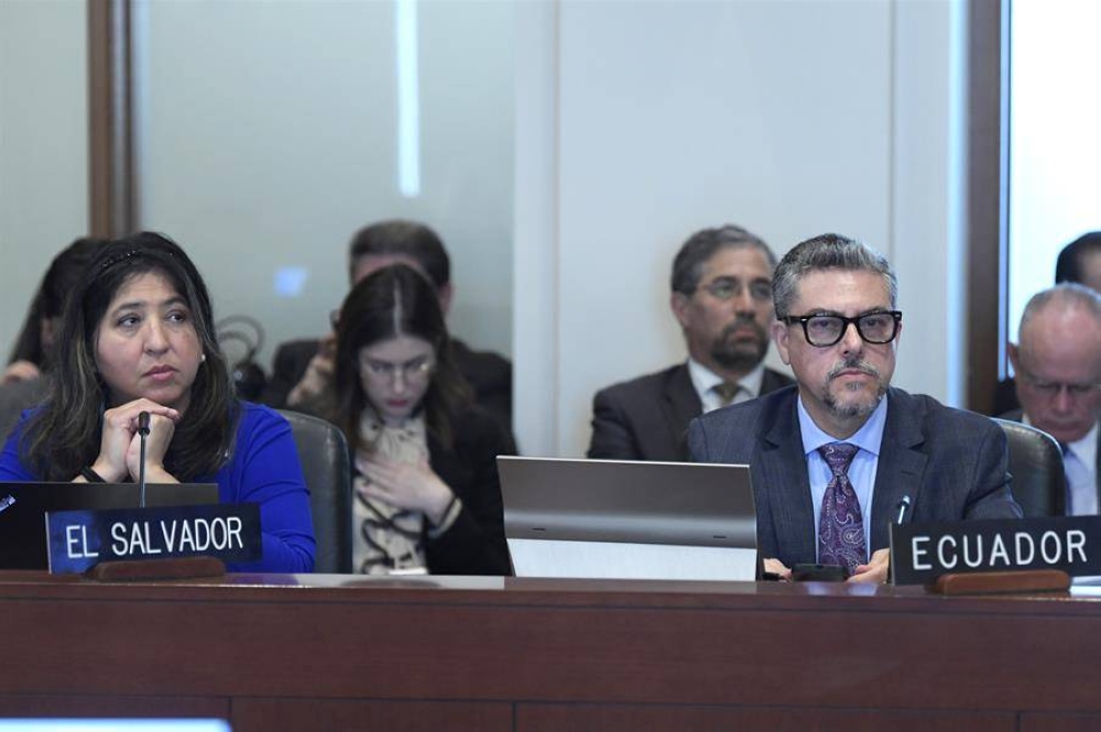 El viceministro de Movilidad Humana de Ecuador, Alejandro Dávalos, y la representante de El Salvador ante la OEA, Wendy Acevedo, en sesión extraordinaria del Consejo Permanente de la OEA este miércoles. / EFE.
