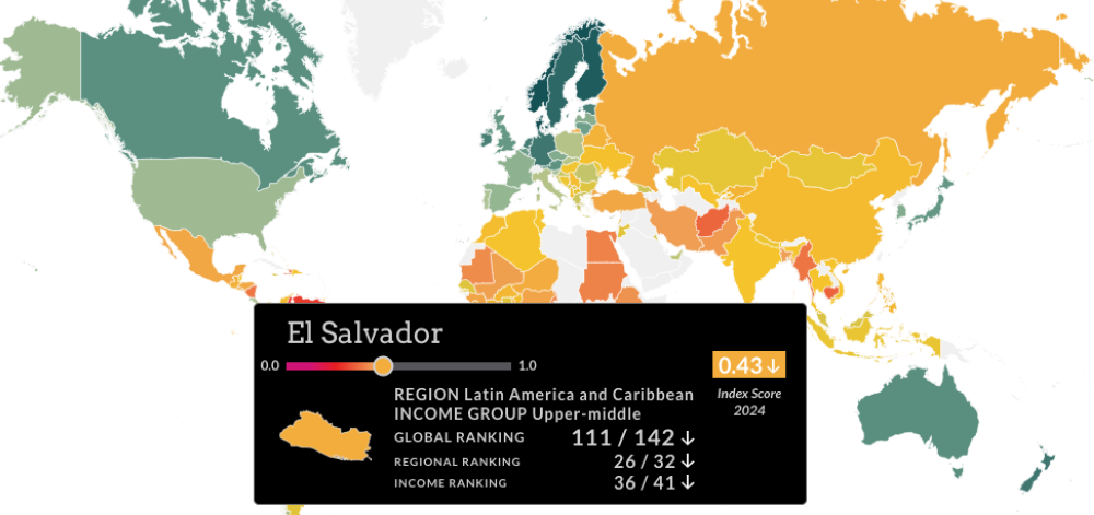En general, El Salvador bajó tres puestos en el ranking mundial y bajó su puntaje de 0.45 a 0.43 en una escala en donde 0 es peor y 1 es mejor. Su calificación mejoró en seguridad y bajó en límites del poder, gobierno abierto, justicia civil y criminal.