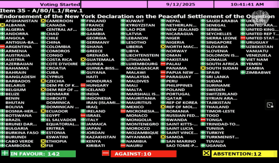 La solución planteada por la Declaración de Nueva York pasa por “un alto al fuego inmediato en Gaza y por la liberación de todos los rehenes, pasa por el establecimiento de un Estado Palestino viable y soberano, pasa por el desarme de Hamás y su exclusión de la gobernanza de Gaza, pasa por la normalización entre Israel y los países árabes, y pasa por último por la articulación de garantías de seguridad colectivas que incluyan a Israel”, indicó el representante de Francia.