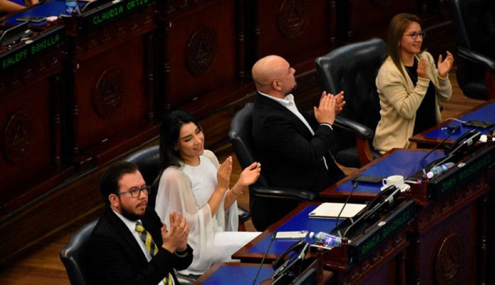 Diputados de Nuevas Ideas y aliados aplaudieron la aprobación de los permisos otorgados al presidente Nayib Bukele y vicepresidente Félix Ulloa. / Emerson del Cid.
