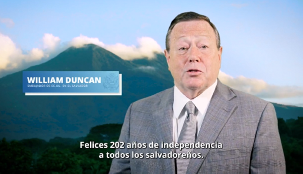 El embajador de EEUU, William Duncan, expresó en un clip de video sus felicitaciones a El Salvador, que este viernes conmemoró los 202 años de independencia patria.