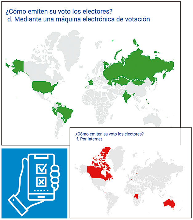 De acuerdo a la Red de Conocimientos Electorales (Ace), conformada por ocho organizaciones líderes en procesos electorales, siete países en el mundo tienen voto por internet: Armenia, Australia, Canadá, Congo, Estonia, Panamá y Suiza.