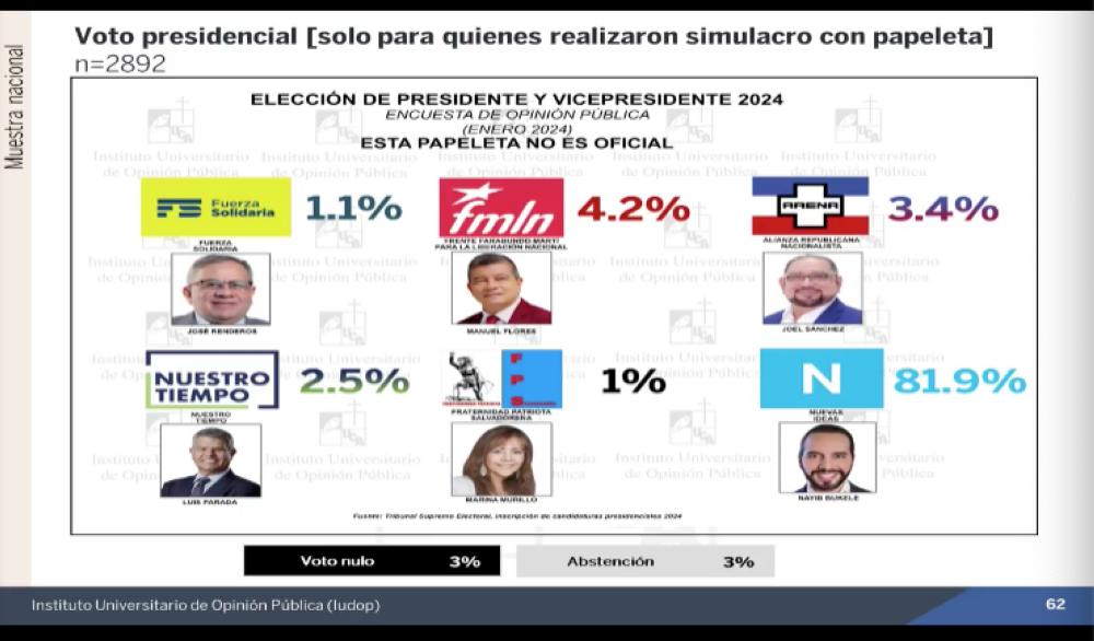 Mediante expresión verbal, siempre para las presidenciales, el 68.7 % de entrevistados respondió que votará por Nuevas Ideas, el 2.3 % por el FMLN, 1.3 % por Arena, 0.5 % por Nuestro Tiempo, 0.1 % por Fuerza Solidaria. Expresamente el 6.6 % de los salvadoreños dijo no irá a votar, el 8.5 % respondió que es secreto, un 10.8 % no respondió y 1.2 % indicó que anulará su voto.