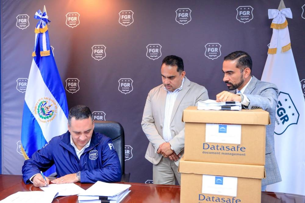 El fiscal general, Rodolfo Delgado, recibe el informe de los abogados Mario Machado y José Alberto Machado Calderón, designados por los diputados para realizar la investigación jurídica a la asignación de fondos a las ONG. / FGR.