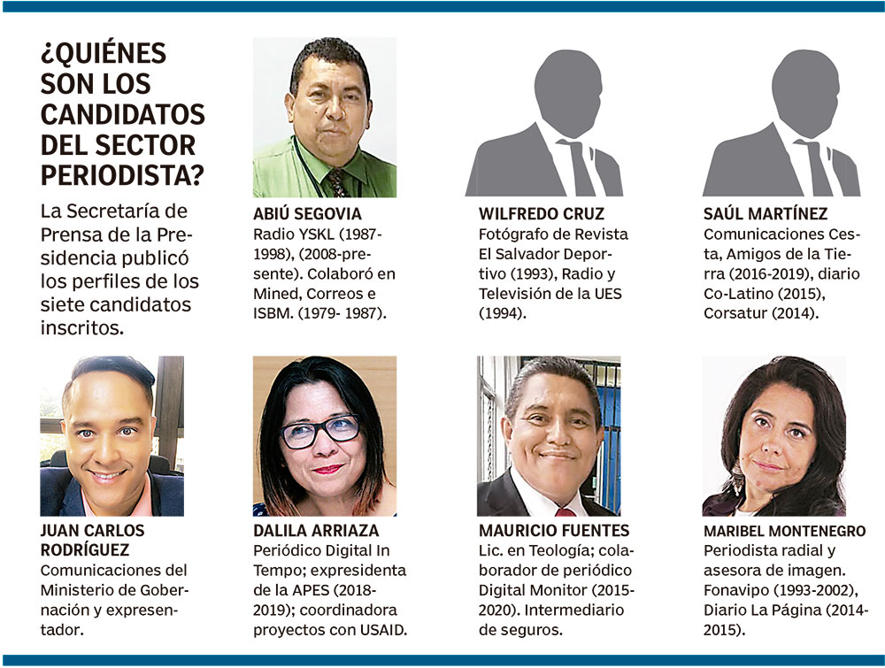 La comisión gubernamental para elegir candidatos a los comisionados del Instituto de Acceso a la Información Pública (IAIP) por el sector de periodistas decidió llevar a cabo esta elección pese a que solo se inscribieron dos asociaciones: la Asociación de Periodistas Independientes de El Salvador (Aspies) y la Cámara de Fotoperiodistas, Camarógrafos y Reporteros de El Salvador (Cafocares).
