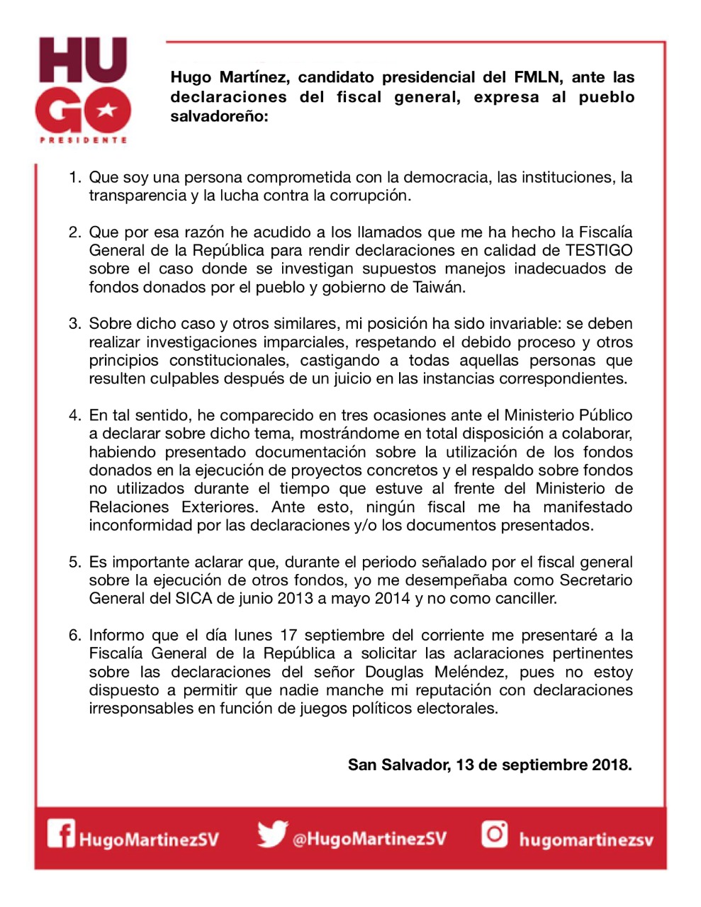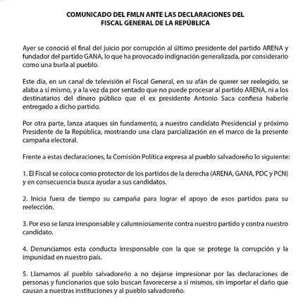 El partido FMLN emitió un comunicado en el cual señalan que las últimas declaraciones vertidas por el fiscal general de la República, Douglas Meléndez, donde se involucra al actual candidato del instituto político, Hugo Martínez, son "ataques sin fundamento (...) mostrando una clara parcialización en el marco de la presente campaña electoral".