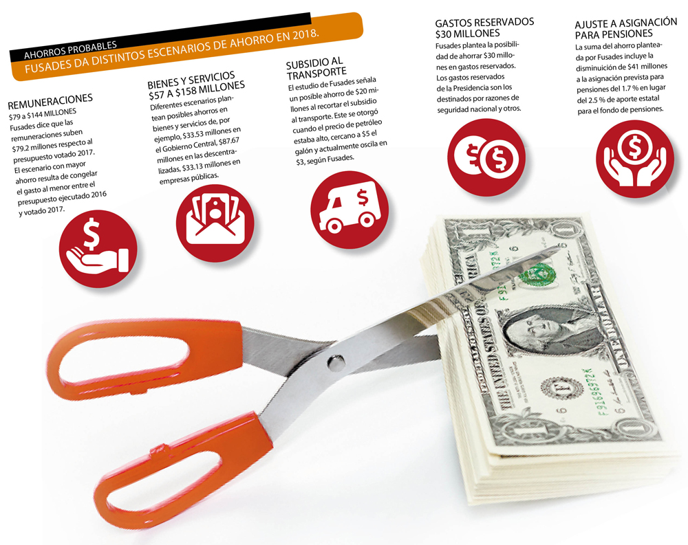 Fusades concluye que pueden haber medidas de ahorro del gasto que reducen la necesidad de financiamiento adicional en el presupuesto de $227 millones, hasta un posible ahorro de $393 millones.