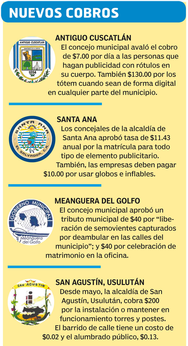 Una es el cobro por rótulos en personas: $7.00 por cada día que una persona se coloque en las calles de Antiguo Cuscatlán con rótulos. En algunas ciudades se observan a personas con carteles anunciando promociones para algunos comercios, entre otros.