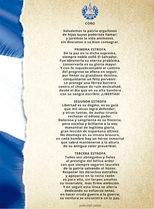 El himno, compuesto por el general salvadoreño Juan José Cañas y el músico italiano Juan Aberle, tiene un coro y tres estrofas, aunque una reforma a la Ley de Símbolos Patrios del 7 de octubre de 1992 legalizó que solo se cantara el coro y la primera estrofa.