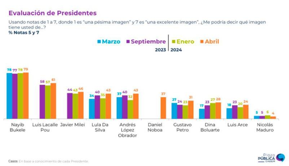 Los líderes latinoamericanos mejor evaluados son @nayibbukele (79%), @LuisLacallePou (61%) y @JMilei (46%) y el peor evaluado es @NicolasMaduro con apenas 4%.