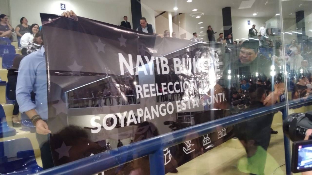 Otros asistentes extendieron una gran pancarta que decía “Nayib Bukele. Reelección Soyapango está contigo” y otro cartel le señalaba: “Van 4 años, faltan 6”.