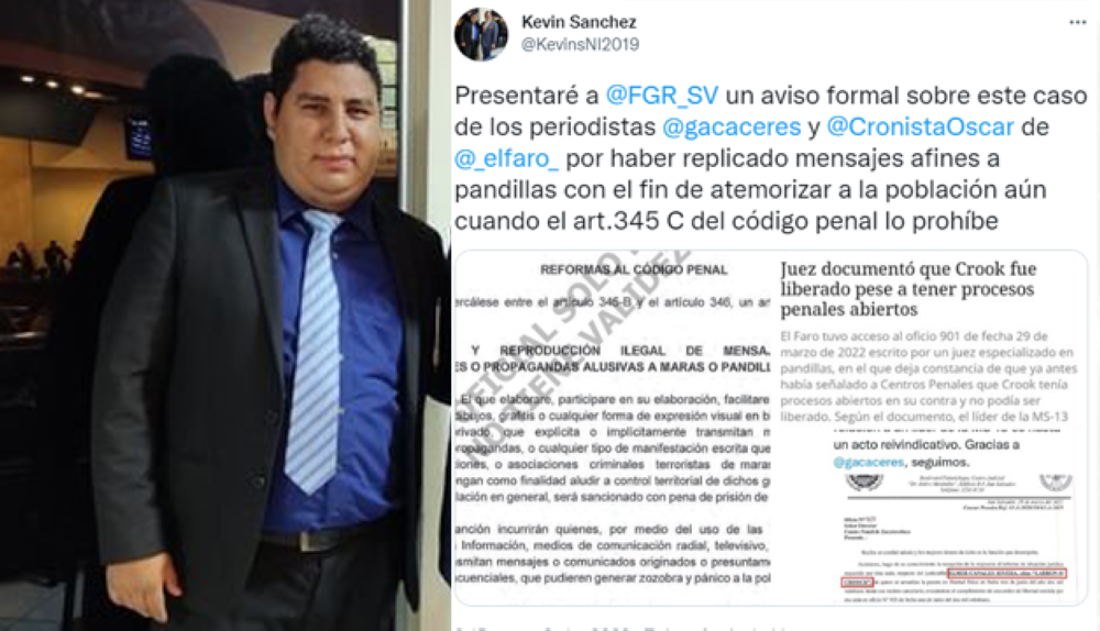 Un miembro del partido Nuevas Ideas amenazó vía Twitter el viernes con presentar un aviso en la Fiscalía General de la República contra los periodistas del medio digital El Faro, Óscar Martínez y Gabriela Cáceres por, según él, “haber replicado mensajes afines a pandillas”, en un reportaje publicado previo a la entrada en vigor de las reformas a la Ley de Proscripción de Maras y Pandillas.
