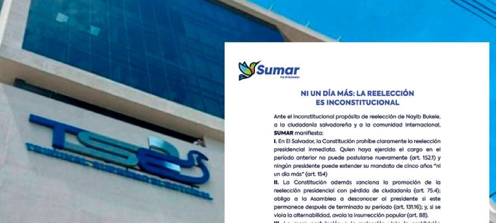En un comunicado de prensa, el movimiento Sumar pidió este miércoles a los magistrados del Tribunal Supremo Electoral (TSE) cumplir la Constitución de la República y rechazar la candidatura presidencial del gobernante Nayib Bukele, quien buscará la reelección para el periodo 2024-2029 con la bandera de Nuevas Ideas.