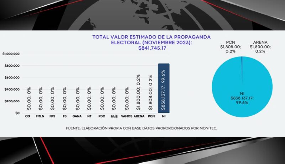 El 99.6 % de la propaganda se concentró en el partido Nuevas Ideas, mientras que los partidos Alianza Republicana Nacionalista (Arena) y el Partido de Concertación Nacional (PCN) hicieron el 0.2 % del gasto total en publicidad durante noviembre.