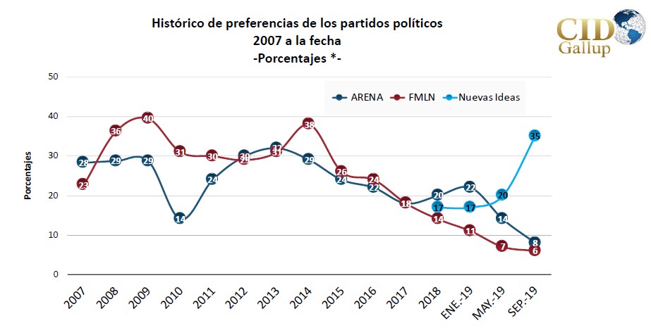 En la encuesta le preguntaron a la población cuál es el partido político de su preferencia: el 35% dijo que Nuevas Ideas, 8% Arena, 6% FMLN y un 5% mencionó a Gana. El 45% de los consultados, por su parte, dijo que "ninguno" o "no sabe/no responde".