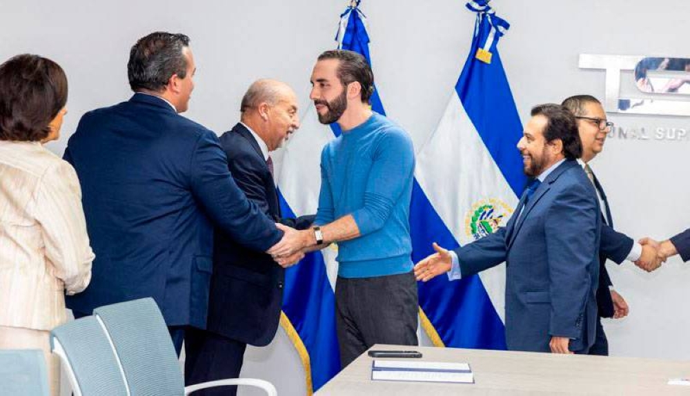 El presidente salvadoreño Nayib Bukele y el vicepresidente Félix Ulloa llegaron la noche del jueves a la sede del Tribunal Supremo Electoral (TSE) a solicitar sus inscripciones como candidato a presidente y vicepresidente del país para el periodo 2024-2029.