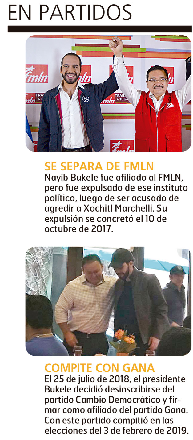 Bukele se convirtió en alcalde de dos municipios bajo la bandera del FMLN, pero sus diferencias con el partido de izquierda lo llevaron a su expulsión el 10 de octubre de 2017. Promovió la conformación del partido Nuevas Ideas, pero no pudo competir para la presidencia con ese partido político. Se afilió a Cambio Democrático (CD) pero debió abandonar el partido que fue cancelado por el Tribunal Supremo Electoral. La presidencia la ganó con la bandera del partido Gana, un instituto fundado por exmiembros de Arena.