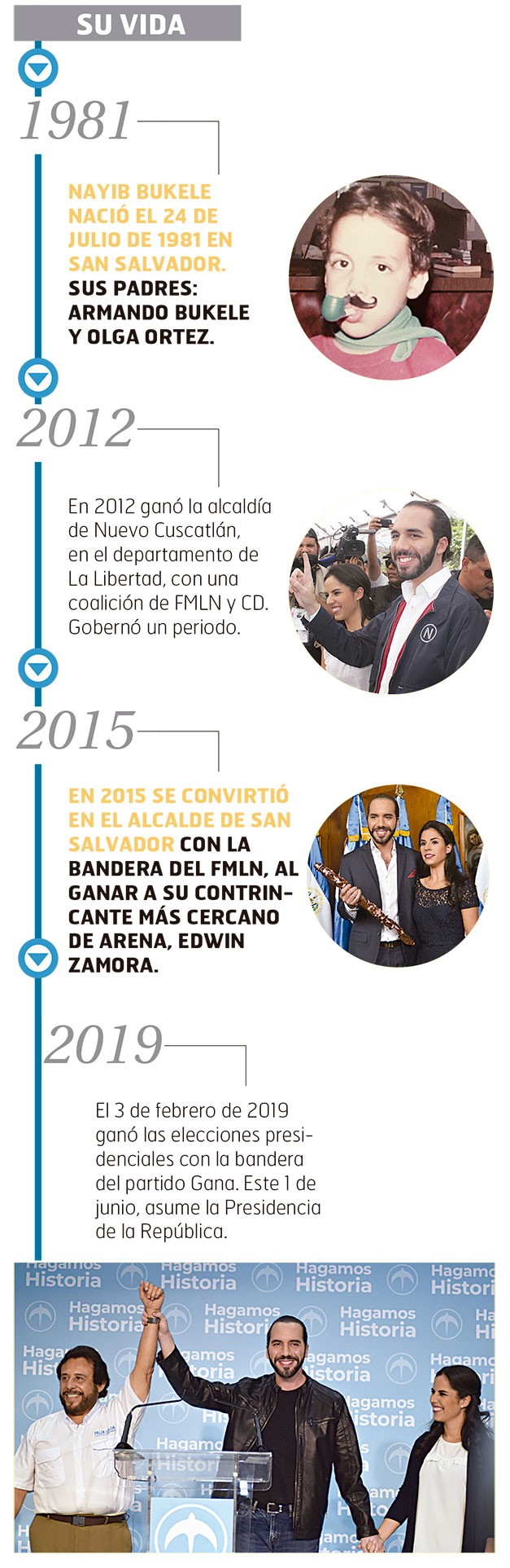 Nacido el 24 de julio de 1981, Bukele incursionó en la vida política en el 2012 cuando ganó la alcaldía de Nuevo Cusca­tlán, en La Libertad y tres años más tarde, en el 2015, se convirtió en el alcalde de la capital, San Salvador. El nuevo mandatario es un político, empresario de la publicidad e importador de motocicletas de la marca Yamaha, quien nació en un hogar integrado por el fallecido empresario Armando Bukele, un doctor en química industrial de origen palestino.