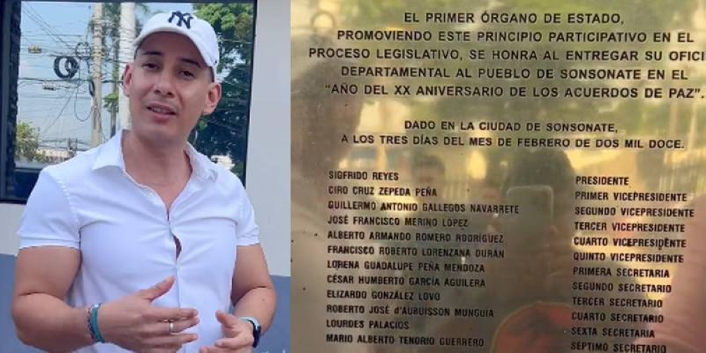 El diputado de Nuevas Ideas Raúl Chamagua divulgó hoy el retiro de una placa de la Oficina Departamental de la Asamblea Legislativa en Sonsonate en la cual se incluyen nombres como de Sigfrido Reyes, Lorena Peña, así como también de Francisco Merino y Guillermo Gallegos.