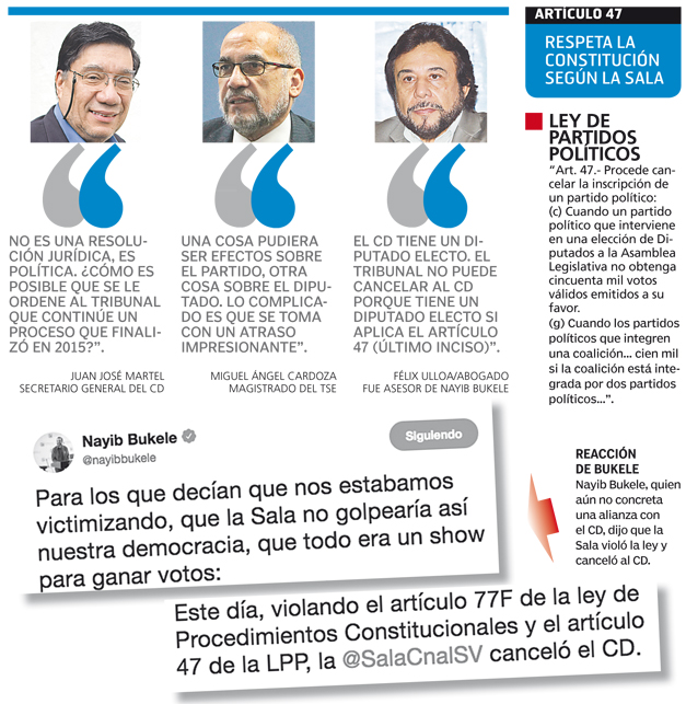 El secretario general del CD, Juan José Martel, consideró que es una resolución política, no jurídica. Aseguró que no es posible que el TSE dé continuidad a una resolución de 2015. En 2011, la Sala declaró inconstitucional un decreto legislativo base para revivir al PCN y al PDC.
