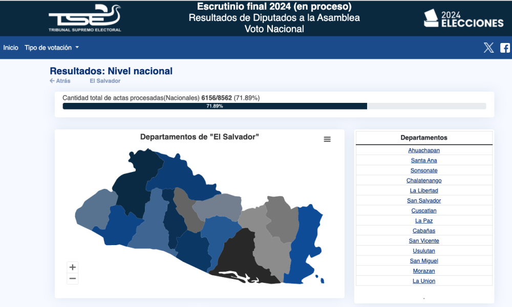 Los resultados, sin embargo, no contienen el 100 % de las actas escrutadas en los 13 departamentos. A nivel nacional los resultados muestran un 71.89% de las actas.