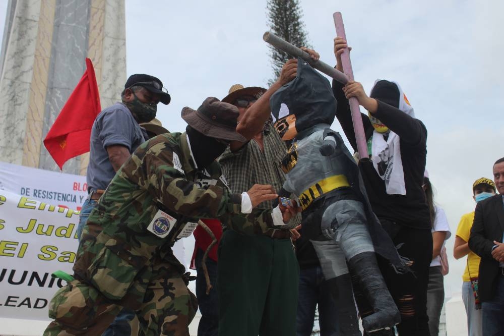 Organizaciones aglutinadas en la Alianza Nacional El Salvador en Paz rechazaron los tres años de gobierno al que tildaron de “dictatorial y fascista” con una protesta desarrollada hoy en la Plaza Divino Salvador del Mundo, actividad que inició con el himno nacional y finalizó con la quema de una piñata de Batman.