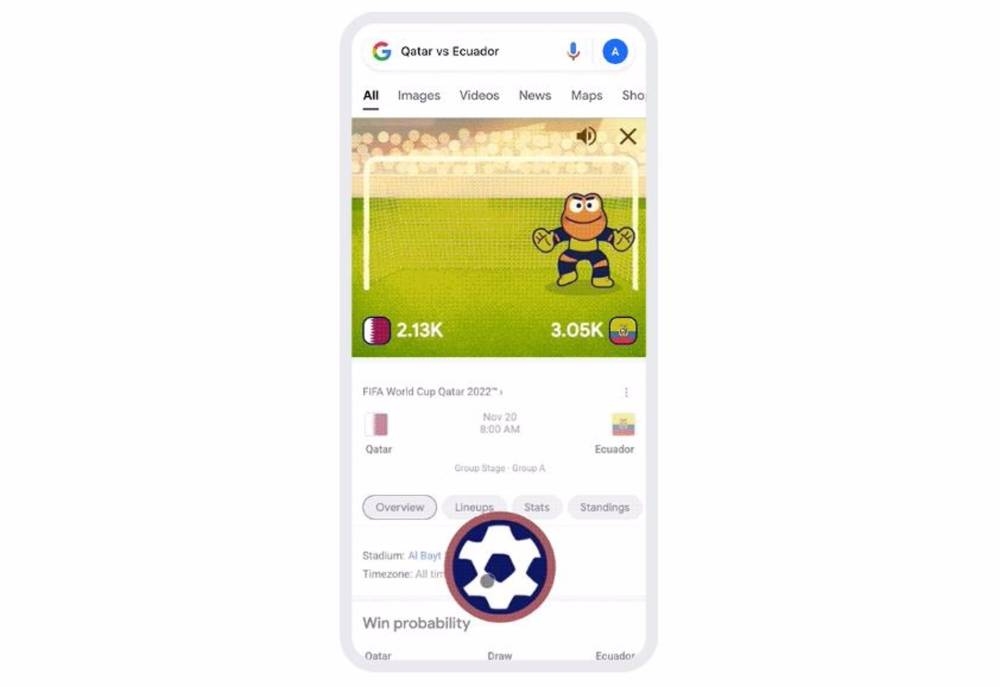 Con motivo del Mundial de Fútbol 2022 que arrancó este fin de semana en Catar, Google lanzó un nuevo mini juego que permite a los usuarios enfrentar a dos selecciones con tiros a portería e introduce un sistema de calificación que regote los resultados de los jugadores a nivel mundial.